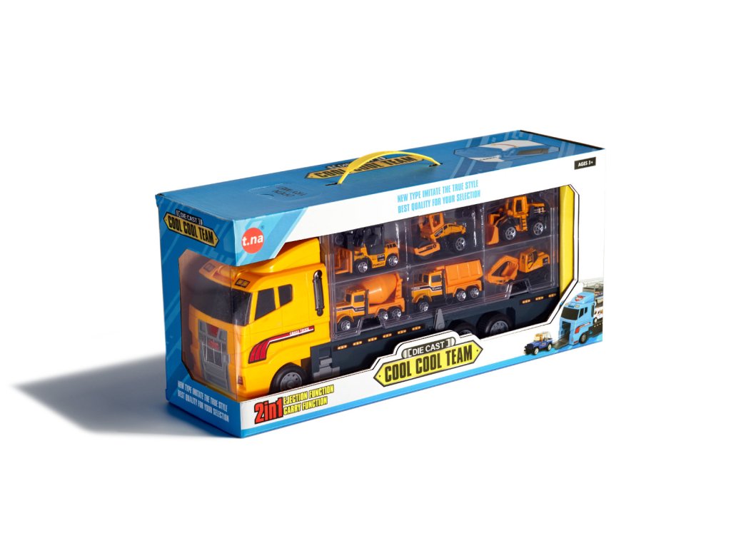 Tento velký tahač s konstrukčními autíčky přiveze na místo všechny stroje potřebné k práci – bagr, míchačku, sklápěčku, jeřáb i válce. Každý z nich je vyroben z kovu s precizními detaily a pohyblivými částmi, které zabaví děti na dlouhé hodiny.