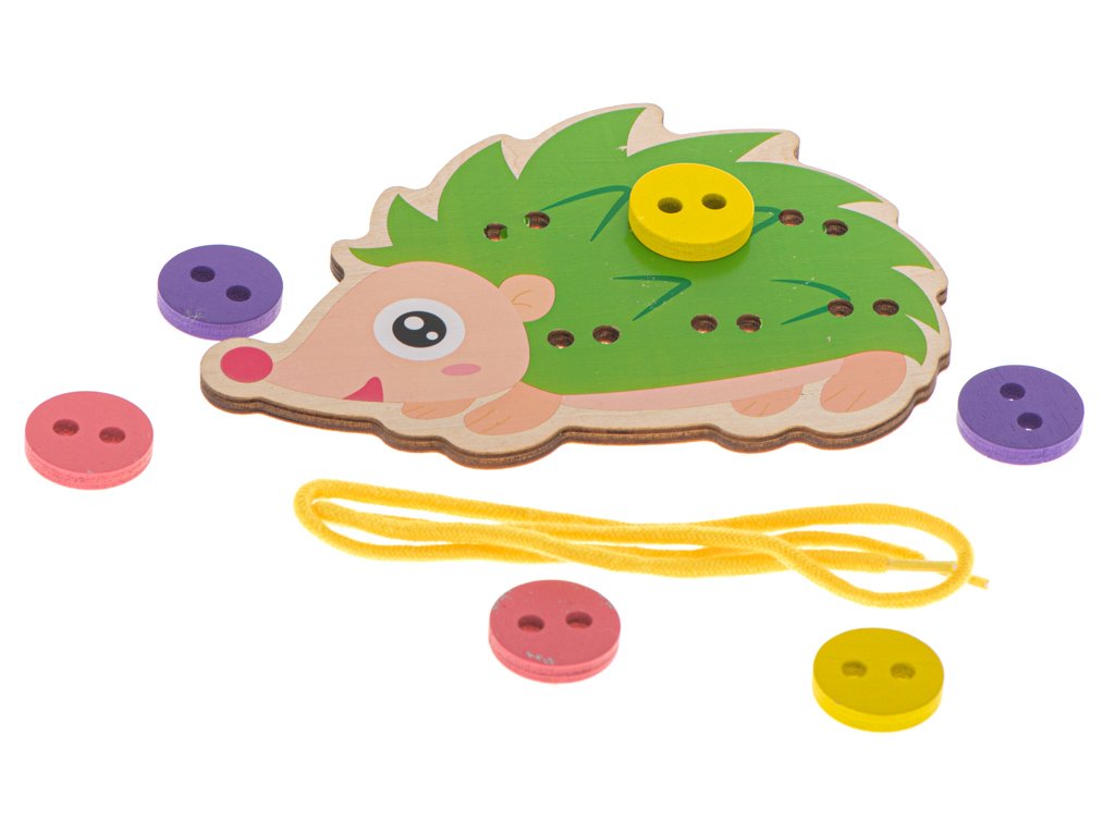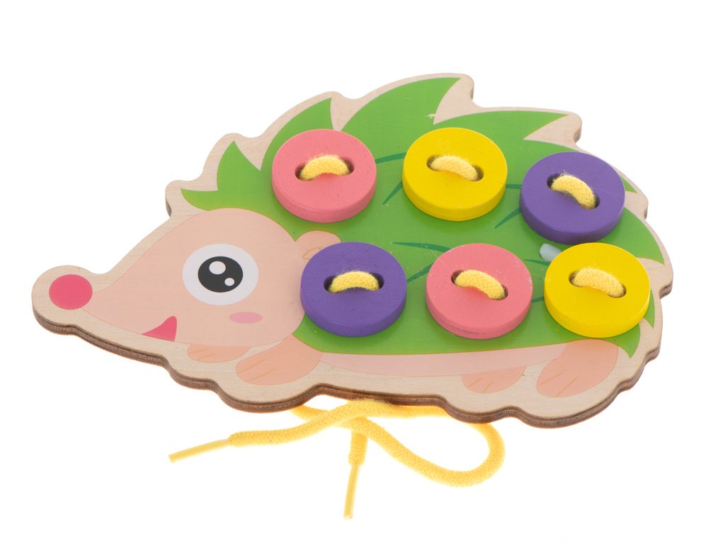 Sada na učení šití je kreativní hračka, která podporuje rozvoj jemné motoriky a manuálních dovedností dětí. Úkolem batolat je provléknout provázek otvory v barevných knoflících a připevnit je k tabuli s potiskem ježka.