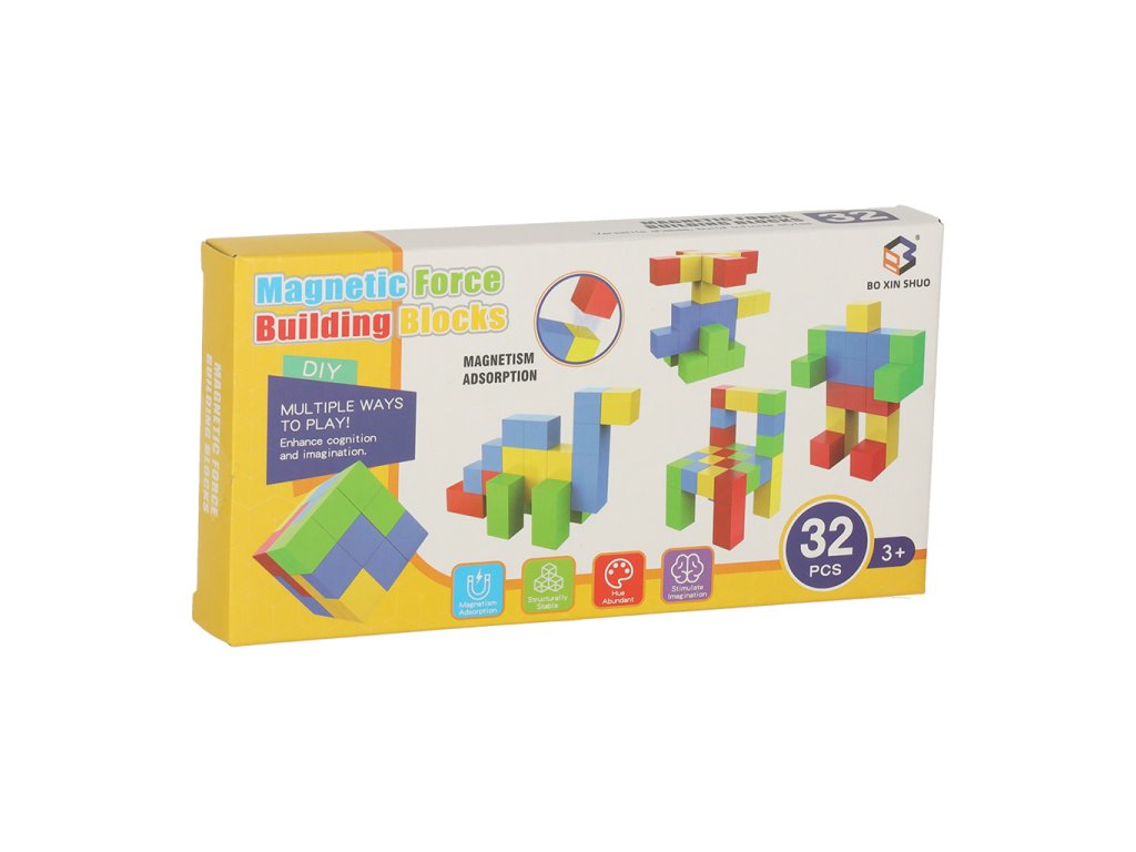 Tato sada 32 magnetických kostek představuje zábavný způsob, jak si děti mohou vytvářet různé figurky a struktury. Každá kostka má čtvercový tvar a díky vestavěným magnetům se k ostatním připojuje, což zajišťuje stabilitu konstrukce. Kostky se dodávají ve čtyřech barvách: zelená, žlutá, červená a modrá. Hračka podporuje rozvoj motorických dovedností, kreativity a logického myšlení.