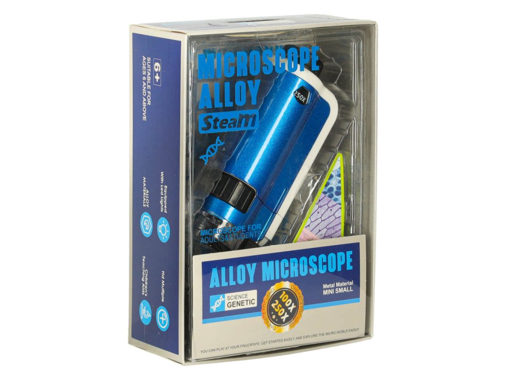Kapesní mikroskop pro děti je vyroben z hliníku. Je certifikován CE.