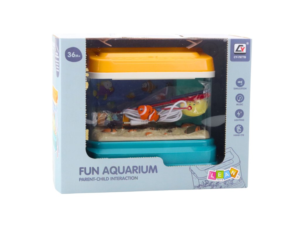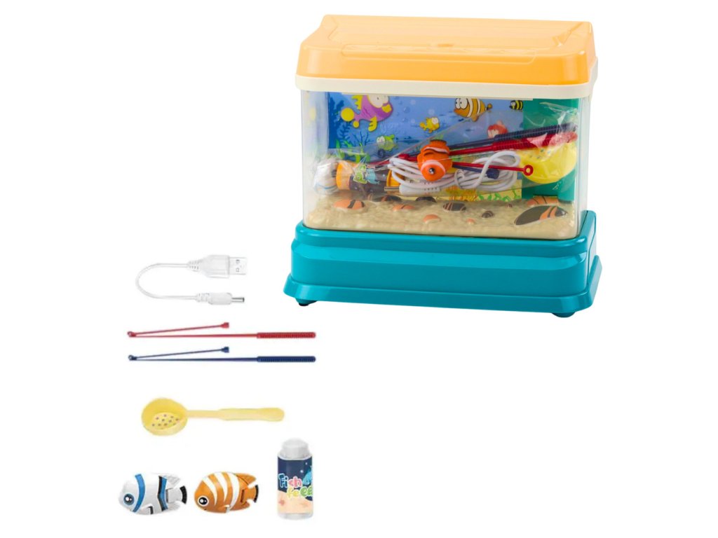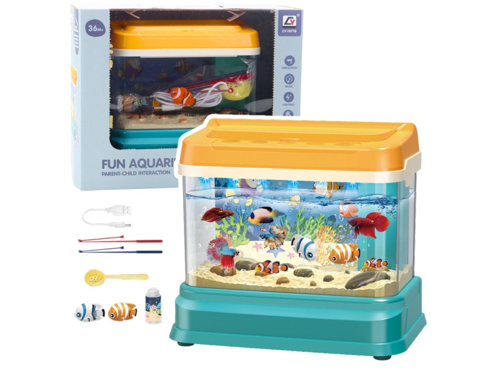 Tato hračka slouží dvěma účelům: vzdělávacímu a dekorativnímu. Děti se mohou bavit lovem ryb pomocí rybářských prutů nebo sítka a zároveň rozvíjet obratnost, trpělivost a motorickou koordinaci. Akvárium lze také použít jako noční světlo – po připojení k napájení přes USB se celá jednotka krásně rozsvítí a z horního krytu vytékají čtyři proudy vody, které vytvářejí efekt bublin. Další výhodou je vestavěná příjemná melodie, která dodává zábavu a vytváří relaxační atmosféru.