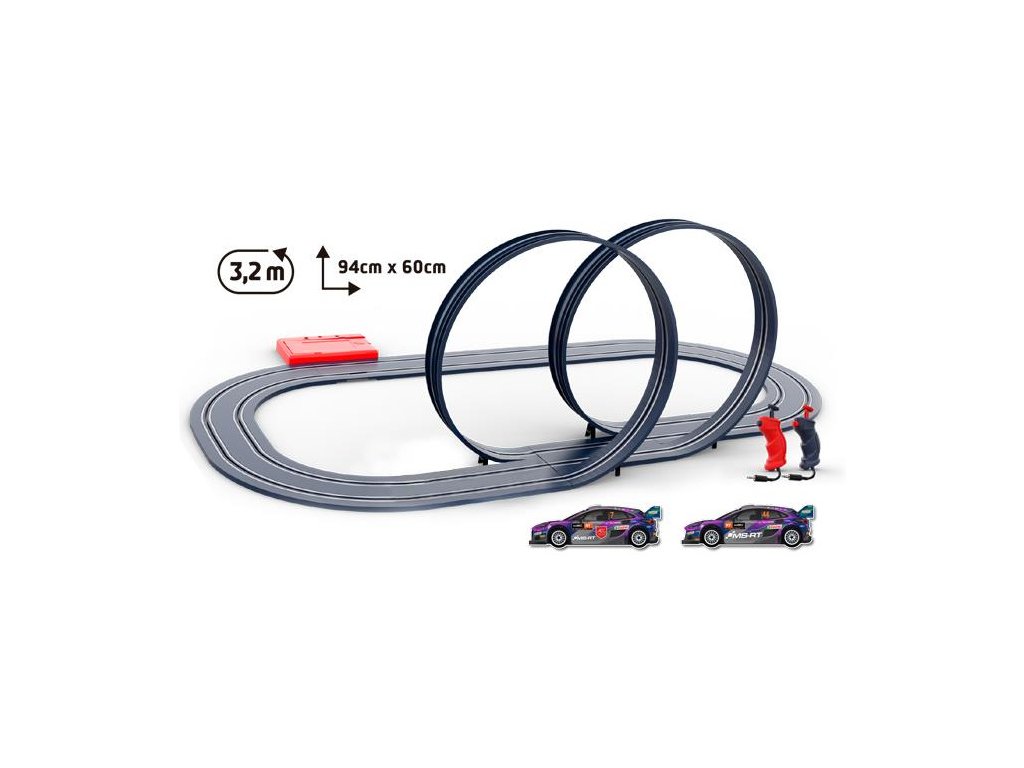 Elektrická autodráha pro děti i dospělé v měřítku 1:50 - WRC Hybrid Boost. Délka tratě 3,2m, 2 auta rally, 4 konfigurace trati, dvojitý looping. Provoz na tužkové baterie. Ovladače jsou přizpůsobeny dětské ergonomii, mají funkci TURBO a omezení výkonu. Auta Ford Puma. Rozměry autodráhy 94 x 60 cm.