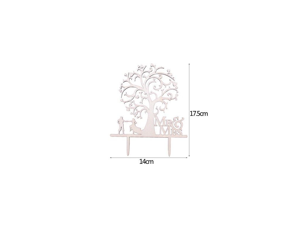 💍 Elegantní zápich na svatební dort ve tvaru stromu života s romantickým motivem novomanželů a nápisem MR & MRS dodá vašemu dortu kouzelný vzhled.Je vyřezaný z kvalitní překližky a působí jemně, slavnostně a stylově.